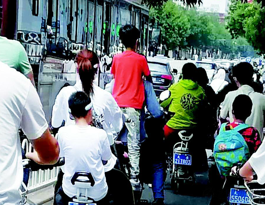 拍攝經過:這是我7月13日途經三墻路時看到的一幕,一名男子騎一輛電動自行車,車后有個孩子站著,雙手扶著騎車人的肩膀,探著腦袋向前看。孩子雙腳踩在車后方小小的踏板上,稍有不慎就可能跌落。7月12日,本報報道過一個女孩坐電動車右腳被卡一事。在此提示廣大家長,騎車帶孩子出行一定要注意安全,防止好動的孩子發生意外,遭受傷害。