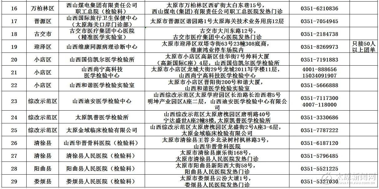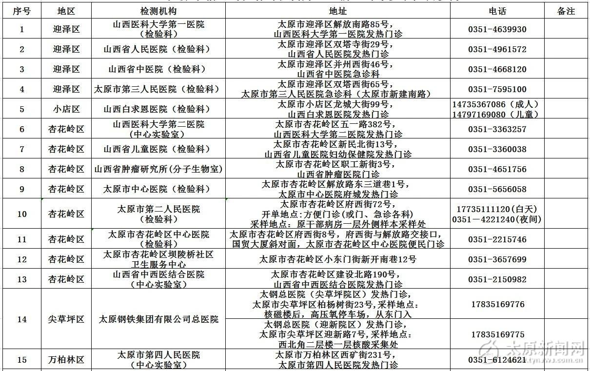太原市轄區內現有對社會開放的新冠病毒核酸檢測機構