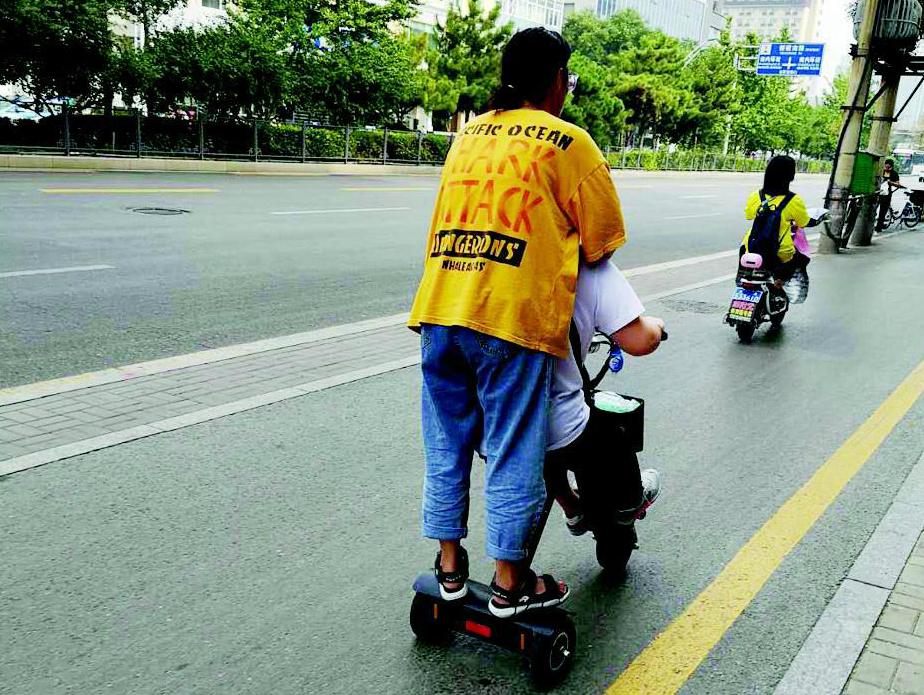 拍攝經過:這是8月3月,我在平陽路平陽西二巷口往北30米路東非機動車道上看到的場景:一名男子騎著微型折疊電動車向前行駛,車后一名女子則站在后輪擋泥板上,看著十分危險。珍愛生命,安全出行。