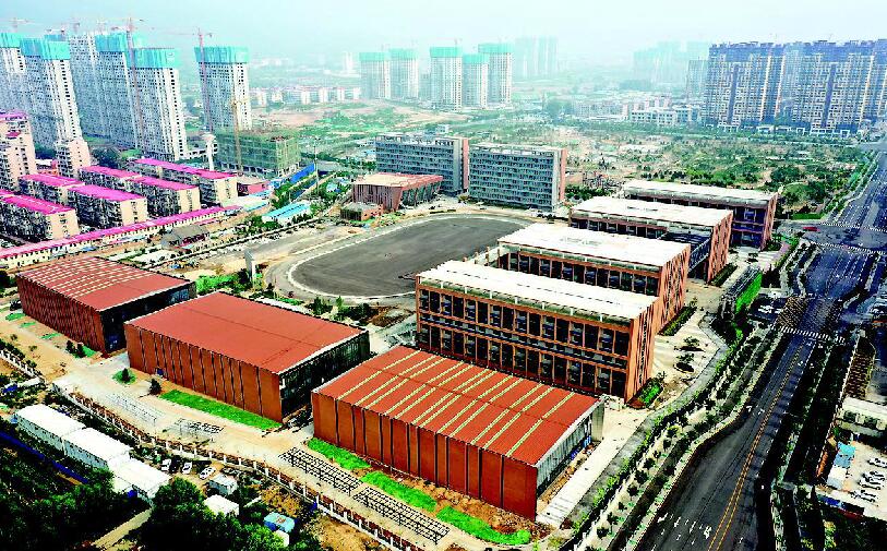 校園西面是一幢雙層餐廳,餐廳外觀設計別致,可同時容納千余人就餐,目前在進行最后的掃尾工作。實驗樓、圖書館、機房、階梯教室等教學場所齊全完備,體育館、游泳館等活動場館一應俱全。整個校園布局現代大氣,又不乏精致巧思。