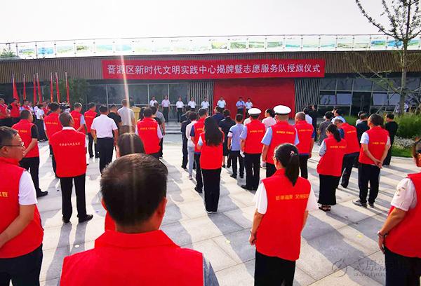 當日的推進會上,還舉行了晉源區新時代文明實踐中心揭牌暨志愿服務隊授旗儀式。與會人員現場觀摩了晉源區新時代文明實踐中心、晉祠鎮新時代文明實踐所,詳細了解陣地建設、隊伍建設及相關工作開展情況。