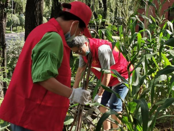 中北社區西區閣子樓樓宇前后個別居民占用綠化用地,私栽亂搭菜架瓜棚,不僅破壞了整體美感,也未達到《太原市創建全國文明城市實地指導手冊》和《第三方測評報告》中的指引標準。志愿者們身著紅馬甲,頭戴小紅帽,在菜主的協助下,拿著手中的剪刀剪開菜架的綁繩,細心的將纏繞的莖蔓解開,彎腰雙手用力將架棍連根拔出,盡量不損傷菜的根莖,然后將架棍集中收放。此次清除菜架18架、瓜棚16個、拔出架棍約600根,清理面積近2000平米,直接和間接受益居民群眾近5000人。