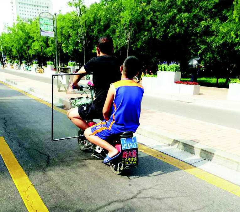 拍攝經(jīng)過:8月8日,我在濱河西路省博物院附近非機(jī)動車道見到這樣一幕:一名男子騎著電動車,后面帶著個孩子,前方居然還夾著一塊玻璃,搖搖晃晃,看上去非常危險。安全無小事,時時要謹(jǐn)慎,希望大家提高交通安全意識。