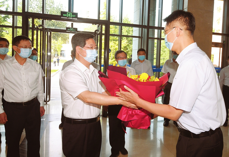 九月九日,教師節(jié)前夕,省委書記樓陽生來到山西大學(xué)看望慰問教學(xué)科研一線教師,向光電研究所所長張靖教授送上鮮花和節(jié)日祝福。李聯(lián)軍 攝