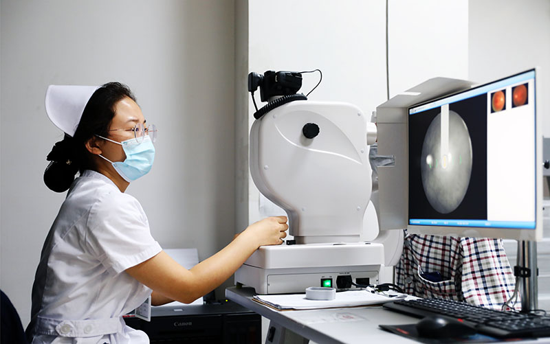 內(nèi)一診區(qū)17號(hào)診室是內(nèi)分泌科實(shí)驗(yàn)室,表情嚴(yán)肅的“檢查員”們正在一絲不茍、專心致志地依次為每位患者進(jìn)行著血糖監(jiān)測(cè)以及一系列相關(guān)并發(fā)癥的篩查。
