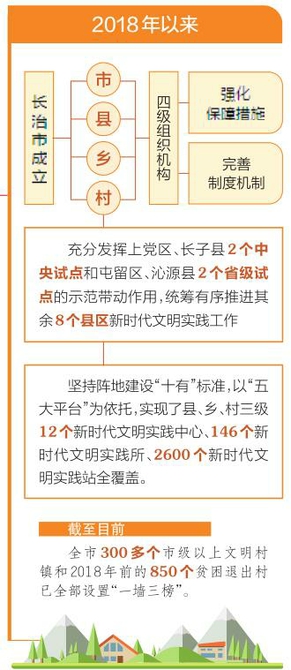 近年來,長治市以“推動移風易俗、樹立文明鄉風”為主題,深入開展新時代文明實踐工作,農村精神文明建設堅持以培育和踐行社會主義核心價值觀為根本,深化鄉村文明建設,努力建設科學規劃布局美、設施完備生活美、村容整潔環境美、服務健全身心美、創業增收致富美、鄉風文明和諧美的文明鄉村。一個個文明村鎮,猶如美麗的畫卷,鑲嵌在青山綠水之間,文明成為長治鄉村最亮麗的風景。