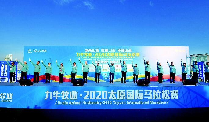 羅清宇、張復(fù)明、李曉波等為2020太原國(guó)際馬拉松賽鳴槍發(fā)令。趙世凱 攝