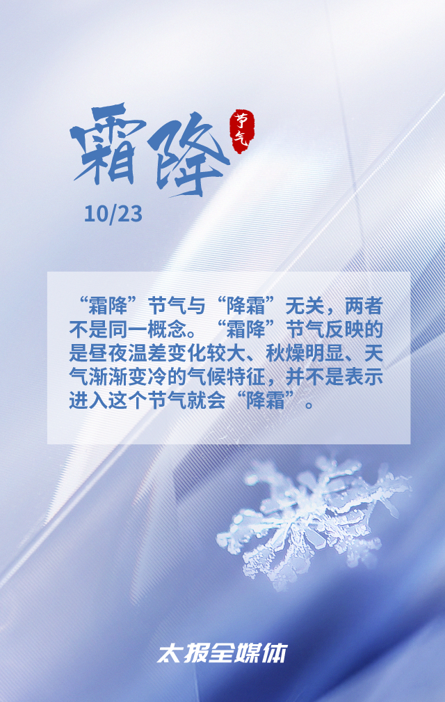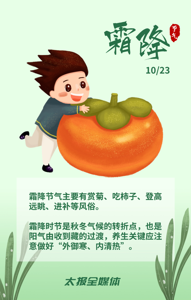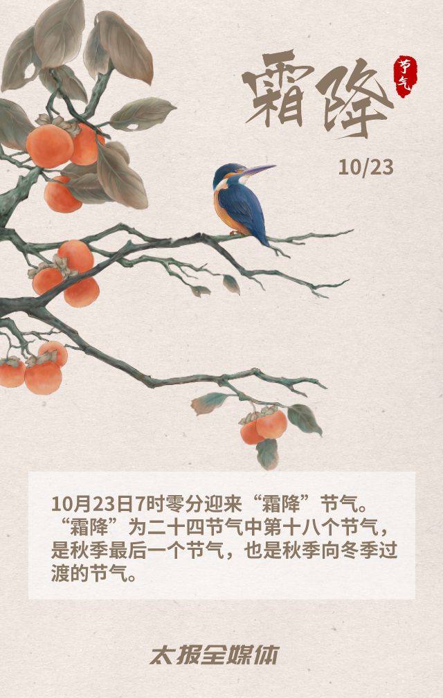 10月23日7時零分,霜降至。秋天接近尾聲,秋意逐漸淡去。霜降時節(jié),冷空氣活動頻繁,氣溫氣流變化劇烈,晝夜溫差增大;作物、草木開始泛黃、落葉,進入晚秋;節(jié)老年人要穿上厚襪子,年輕人不要再裸露腳踝和膝蓋。