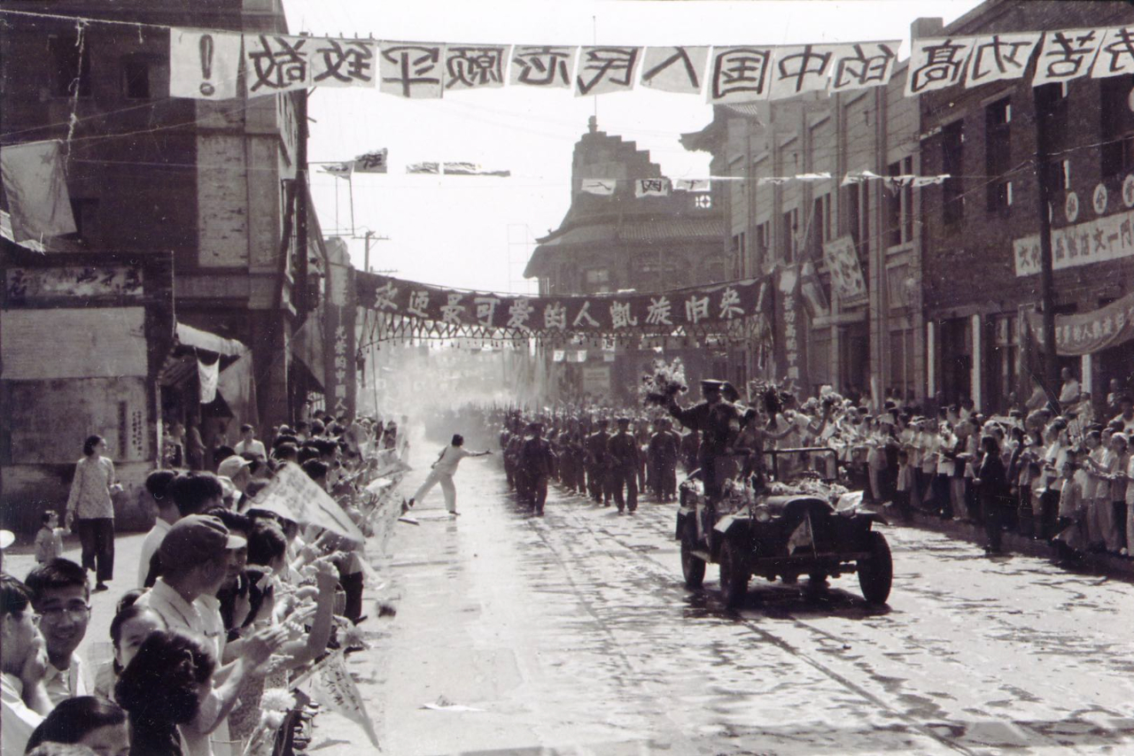 圖為志愿軍部隊(duì)通過太原鼓樓街