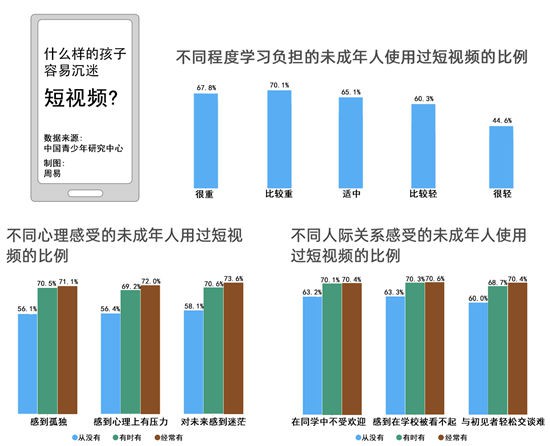 調查同時發現,感到孤獨、心理上有壓力、對未來迷惘的中小學生接觸短視頻的比例更高。