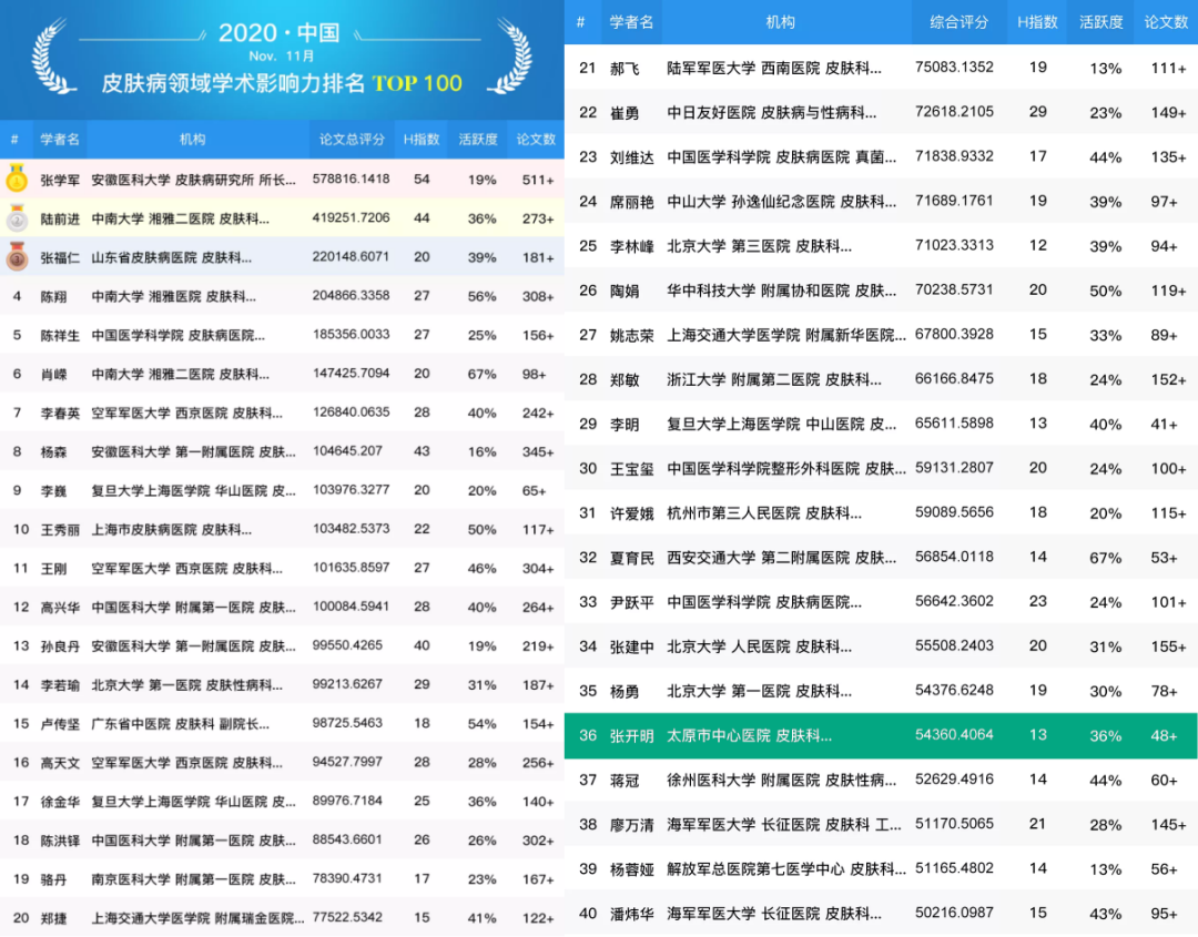 近日,“全球學者庫”基于論文的學者學術影響力評價方法、指標體系和數學模型,對我國醫學研究人員的論文進行了綜合評價。太原市中心醫院皮膚疾病診療中心張開明主任以36名的排名榮登百強。