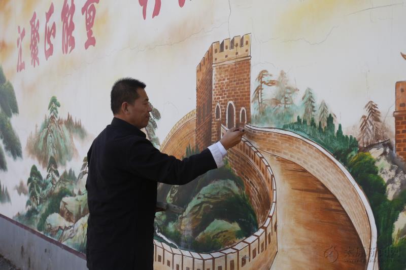晉源區楊家村,王學文一手持顏料盒,一手持畫筆,在巨幅的“匯聚正能量,共筑中國夢”壁畫上修修補補,壁畫上長城屹立、迎客松大氣、黃河從容。