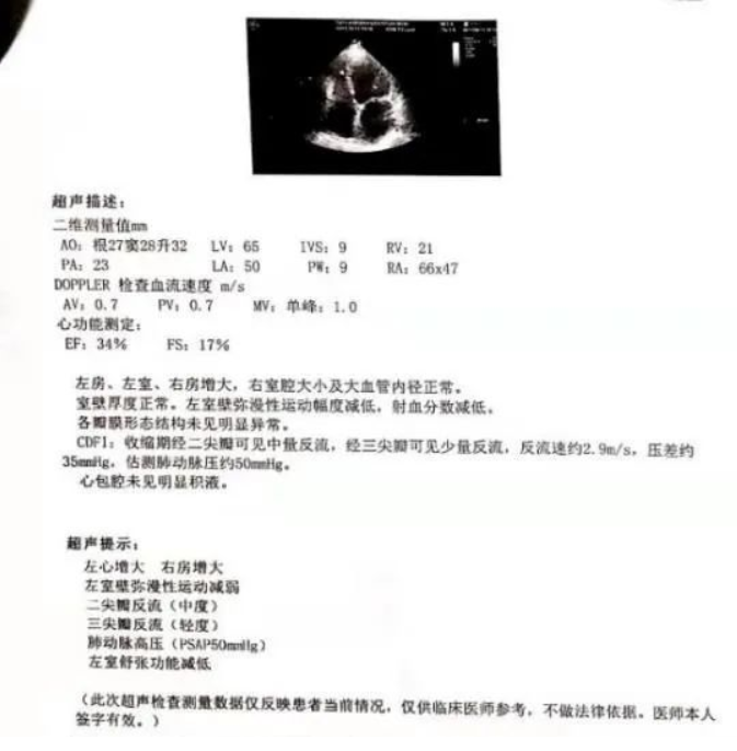 患者行心臟超聲顯示:EF34%,右房66*47mm,左房50mm,IVS 9mm,右室21mm,左室65mm,動態心電圖提示頻發室性早搏,短陣室速,經過規范的內科藥物治療,心力衰竭及肺部感染的癥狀及體征基本控制。