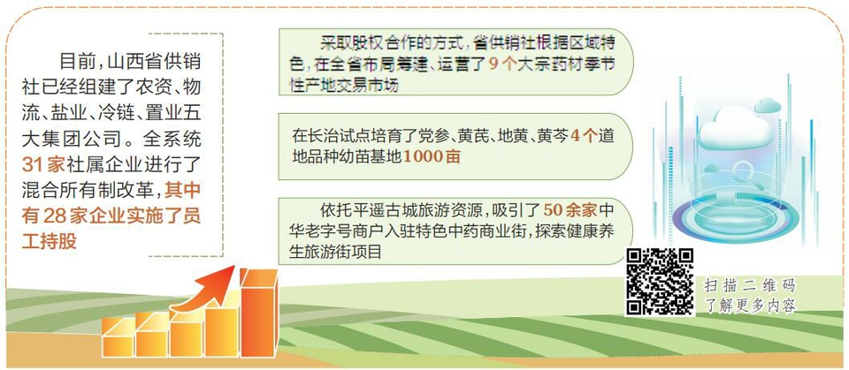 目前,山西省供銷社已經組建了農資、物流、鹽業、冷鏈、置業五大集團公司。全系統31家社屬企業進行了混合所有制改革,其中有28家企業實施了員工持股。