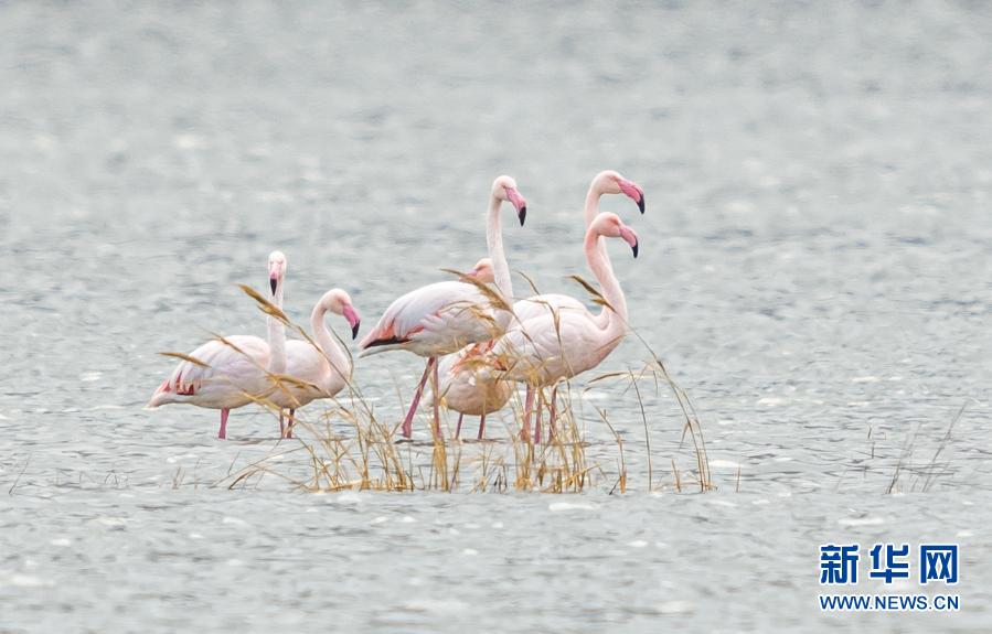 這是在山西省運城市鹽湖拍攝的火烈鳥(12月13日攝)。