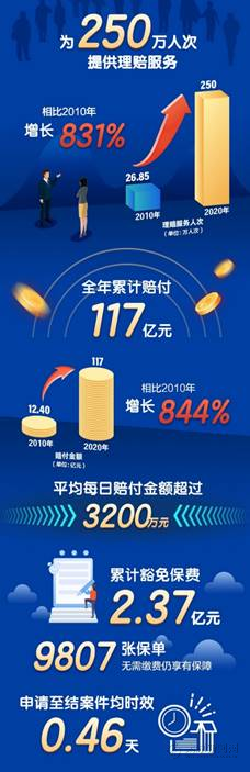 2020年,新華保險累計為250萬人次提供理賠服務,理賠總金額高達117億元,日均賠付金額超過3200萬元。十年間,理賠服務人數和理賠總金額均增長了8倍多。公司去年累計為客戶豁免保費2.37億元,9807張保單無需繳費仍享有保障。