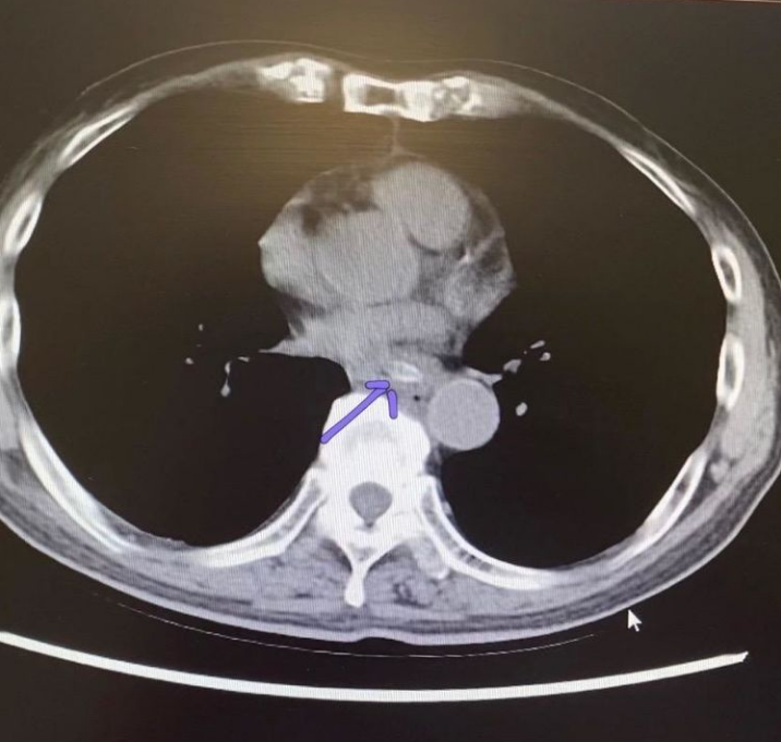 ▲王大爺的胸部CT提示:食管下段可見一異物嵌頓