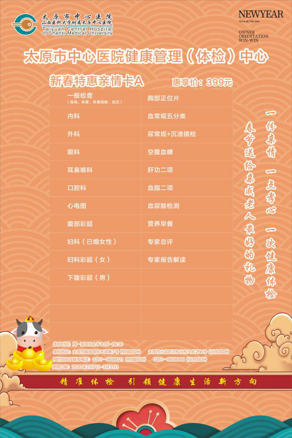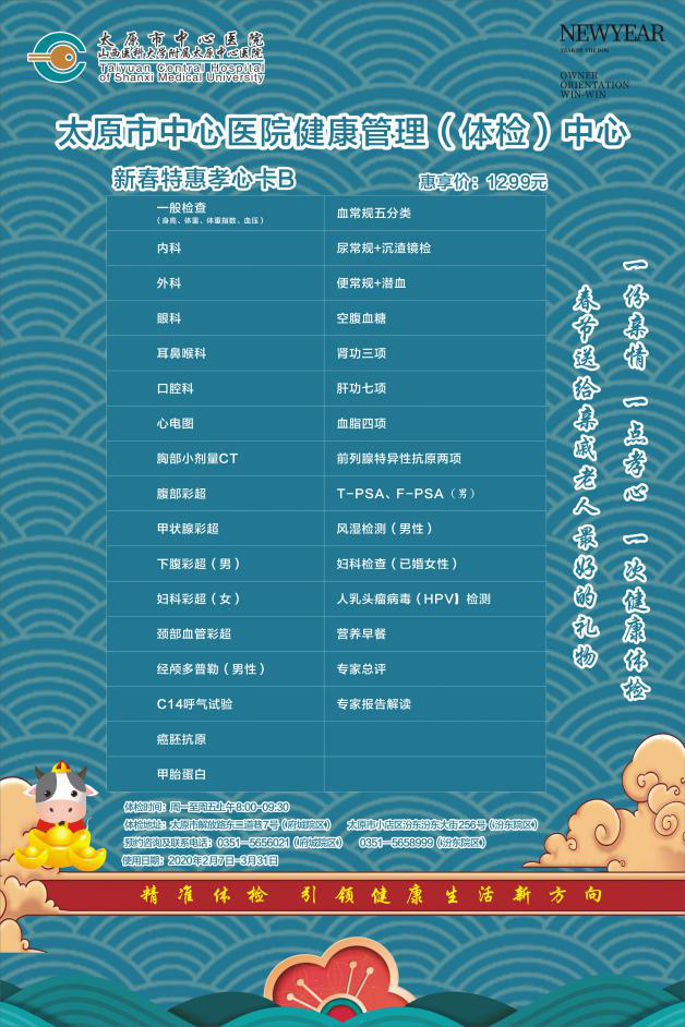 太原市中心醫(yī)院體檢中心始終秉承“以人為本、兼容并蓄、尚德礪能、嚴(yán)謹(jǐn)卓越”的院訓(xùn),打造一流的環(huán)境、一流的設(shè)備、一流的技術(shù)、一流的服務(wù)、一流的管理、一流的口碑,為社會各界團(tuán)體單位或個人提供最優(yōu)質(zhì)、高效、專業(yè)的健康管理體檢服務(wù)!