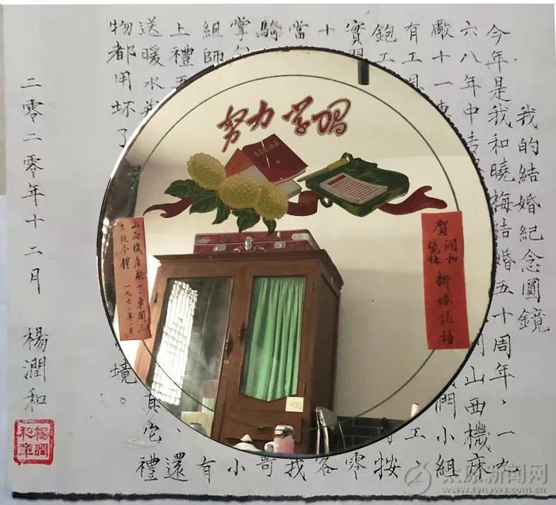 1971年楊潤和和老伴兒曉梅領了結婚證。當時提倡革命婚禮,批判大操大辦。楊潤和騎自行車把曉梅接到家里,當時小組師傅們上禮,有三角的、五角的。所送的禮物,除了這面圓鏡,還有暖水瓶、臉盆等。