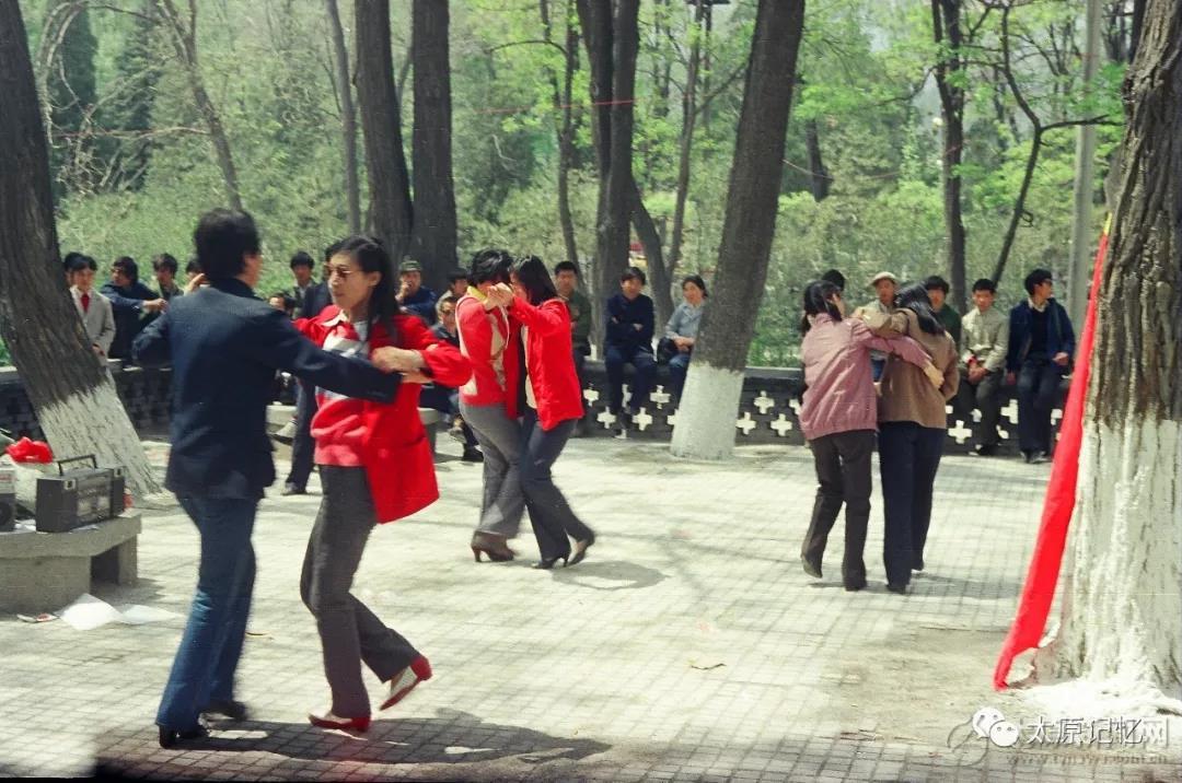 “五四”青年節(jié),太原一電廠和太原市審計局在晉祠公園組織團(tuán)員活動。在雙卡錄音機(jī)播放的舞曲聲中,大家跳起了交誼舞。