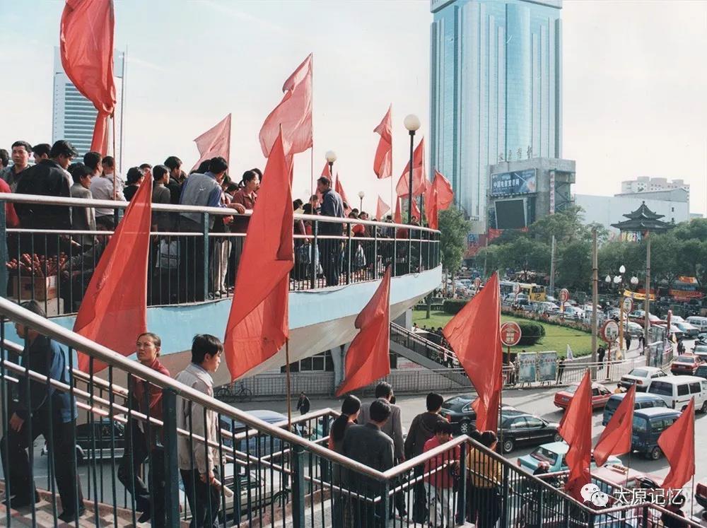 位于寬銀幕十字路口、五一大樓交叉路口的人行天橋開放通行,這是太原首次建造人行天橋。圖為國慶期間五一大樓交叉口的人行天橋。