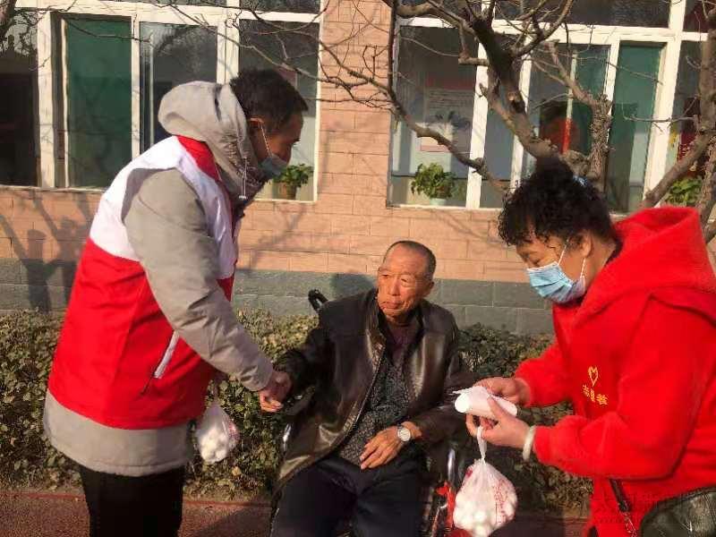 當日上午9時,志愿者們早早在養老院門口集合,在體溫測試完畢后,佩戴口罩排隊進入養老院,將帶來的元宵遞到老人們手中,送上自己的元宵節祝福。