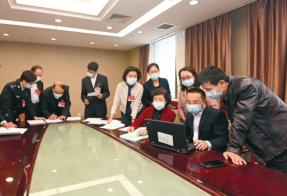 3月10日,山西代表團小組會議間隙,我省代表(左起)楊勤榮、王文保、李秋喜、郝旭、李桂琴在一起分享兩會有關經濟發展、依法治國、社會保障等熱點話題。