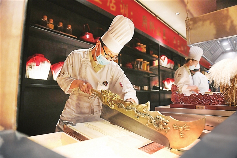 一把青龍偃月刀,起落之間,斬落的不是沙場上的對手,而是齊齊整整、粗細均勻,如機器工藝般的手搟面條。在山西天星海外海餐飲集團旗下的杏花堂,一碗關公大刀油潑面,讓食客們不僅享受到地道的山西面食,廚師手中運用自如的“關公大刀”也成為一道風景,引得人們紛紛駐足。