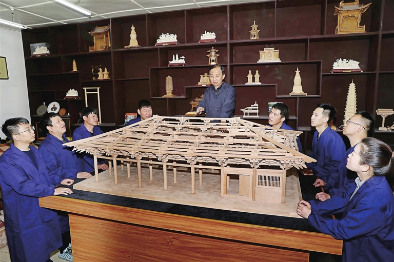 2012年,祁偉成制作完成五臺山佛光寺東大殿的“小樣”,同年出版專著《五臺佛光寺東大殿》。柴澤俊曾滿懷期望地對祁偉成說:“一些古建筑建造技術瀕臨失傳,用機制構件代替手工構件,不僅抹殺了歷代建筑特征和風格,在觀感上也截然異趣。基于此況,傳承古建筑模型制作技藝與營造古建筑“小樣”模型,用以教學、陳展,對古建筑技術人員和工人匠師進行培訓示范,就顯得十分重要了。”這番話讓祁偉成深感任重道遠,在傳承路上不敢有一絲懈怠。成為國家級非物質文化遺產傳承人后,祁偉成向社會廣納門徒傳承“扎小樣”技藝,迄今已收徒8人。