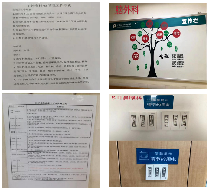 此次6S管理涉及府城院區27個、汾東院區33個臨床科室以及兩院區11個特殊部門。病區考核分為六部分內容(病房、護理站、治療室、治療準備室、示教室、醫辦室、醫護更衣室、值班室和庫房),并在科室顏色管理、目視管理、地標管理、定位管理、防呆措施及建立科室管理制度等創新項目設有加分項。