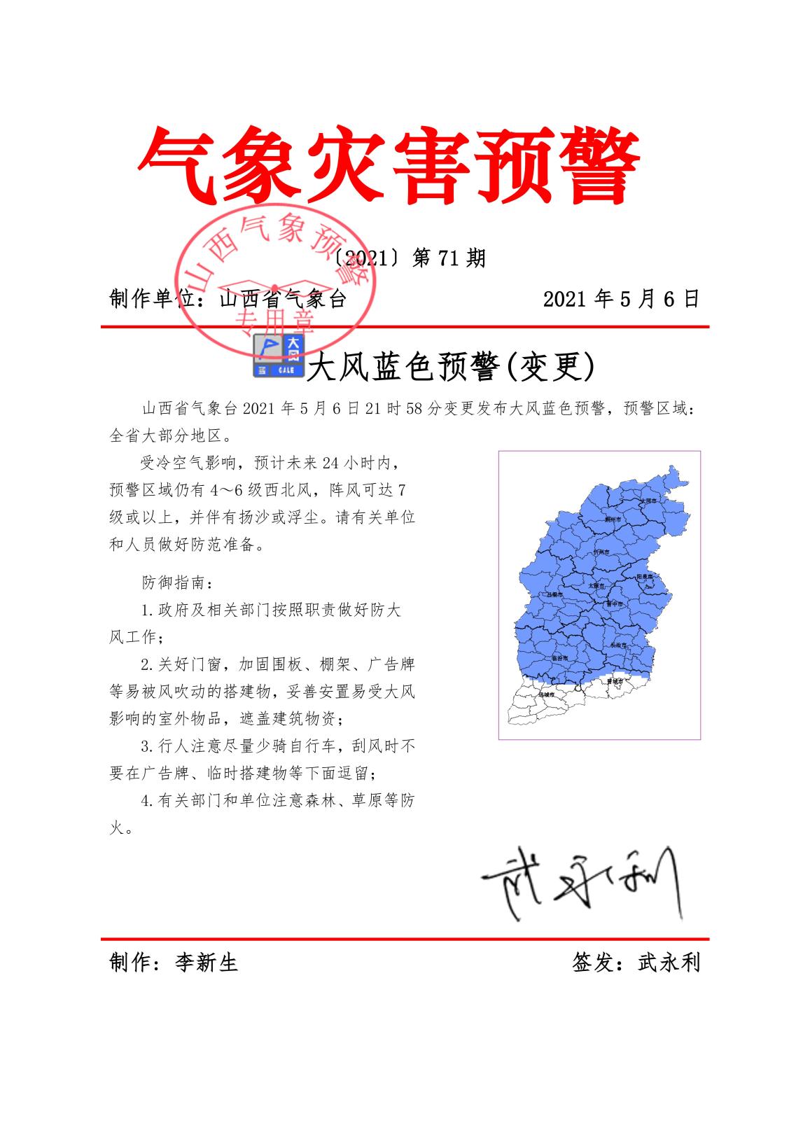 山西省氣象臺2021年5月6日21時58分變更發布大風藍色預警,預警區域:全省大部分地區。