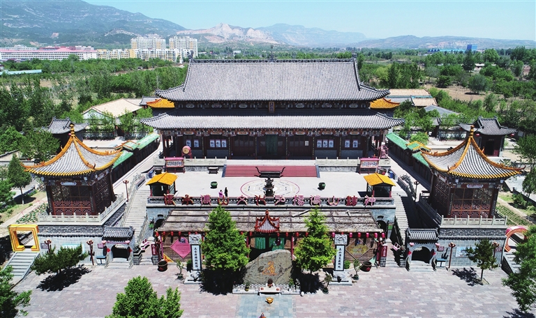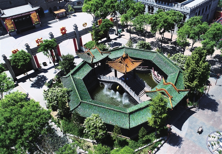 繞過影壁,就來到傅山園文化廣場。該廣場占地面積8000平方米,視野開闊,是舉行文藝演出和文化活動的重要場所。文化廣場正對面的傅公祠山門,是一個仿明代道教風格建筑,采用傳統工藝和材料制作,屋頂青瓦鋪陳,整體古樸、端莊、雄渾,是傅山園的標志性建筑。
