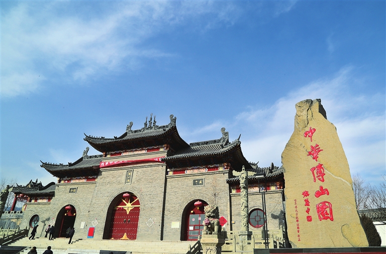 進入傅山園,首先映入眼簾的是一座石制大型牌樓,該牌樓采用傳統工藝,選取砂礫石材精心刻制而成,造型別致,頗有視覺美感。牌樓設計巧妙,配件相互咬合,渾然天成,是三門四柱七頂式,牌樓高7.8米,寓意傅山先生人生78個春秋。正中央上方“中華傅山園”5個大字,遒勁有力,由著名學者姚奠中題寫。穿過牌樓,是一條全長400米商業街,街的盡頭,有一處精美影壁。這處影壁是仿明式古建,正面繪有“崛攬勝圖”,背面與一個戲臺相連,稱為明鏡臺。這處建筑,遠看像一頂轎子,意為抬著傅山先生進入園區,讓傅山先生在故里享受極高待遇。