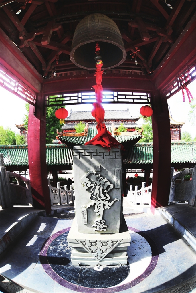 穿過文化牌坊,就來到狀元橋,這里是園區一大亮點。這處八角形回廊,內置十二生肖,對應十二時辰,又融合了八卦理念。回廊圍著的八角形水池內,水如碧玉,錦鯉游動,上面建有拱形石橋,名曰“狀元橋”,橋上建有涼亭一座,頂部鋪設琉璃瓦,亭內掛一大鐘,形成水上有橋、橋上有亭、亭內有鐘的獨特景觀。