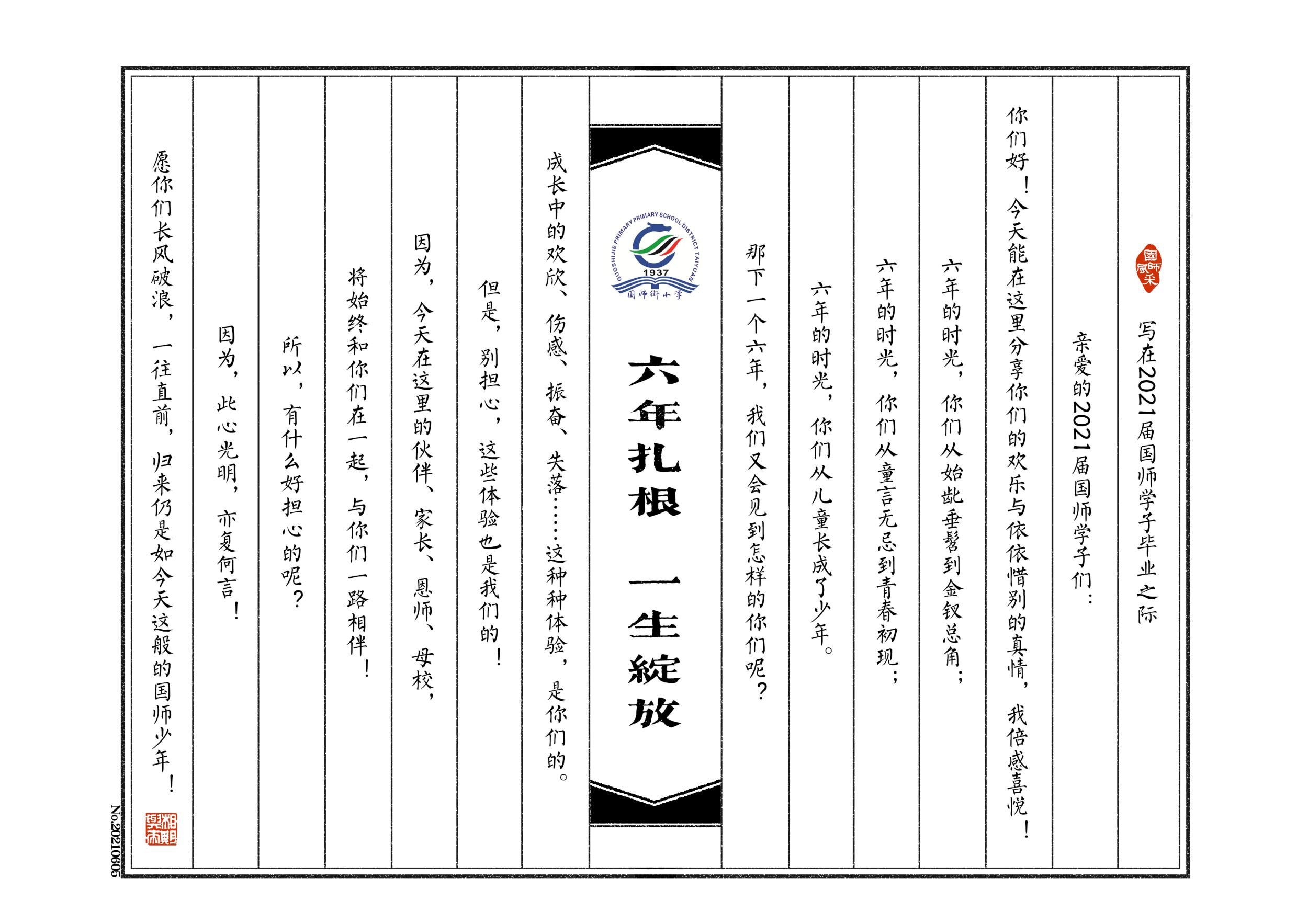典禮上,校長武亞琴送給學生們一封信,寄托母校對孩子們的殷殷期望。150名國師學子響亮宣誓:我將遵守“書道養根,方正為人”的校訓。堅守立根、立德、立言、立行的校風。做有健康體、中華根、世界情、智慧腦的現代中國人。
