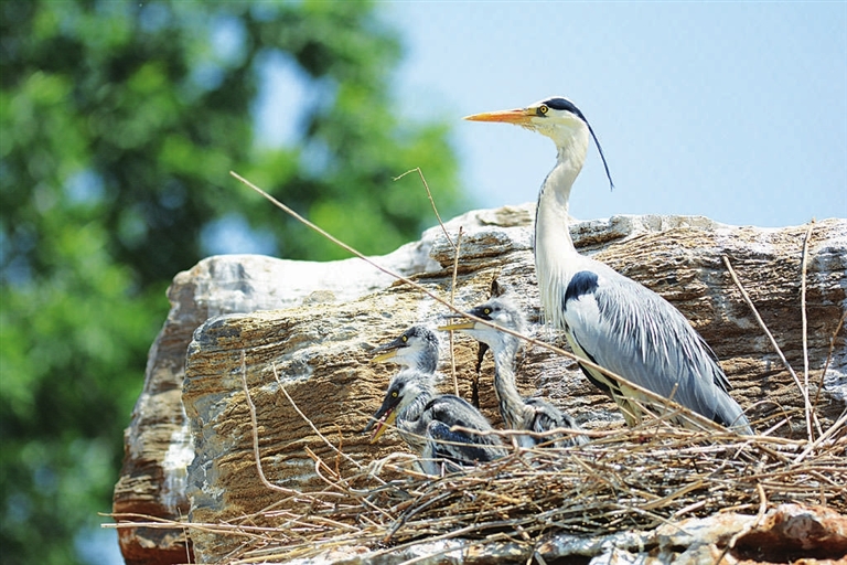 最可愛的要數(shù)赤麻鴨寶寶,媽媽走到哪里,它們就跟到哪兒。雖然身上的羽毛還是灰白色的,沒有媽媽漂亮,但全身毛茸茸的,走路一搖一晃,讓人感覺特別可愛。在百鳥苑的另一個角落,3只小蒼鷺已經(jīng)依稀有了媽媽的模樣,但還不愿意離巢,仍需在媽媽的庇護下成長。