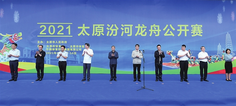 汾河晉陽(yáng)橋段,河面波光粼粼,畫舫古樸典雅,晉陽(yáng)橋雄偉絢麗,彩色的龍舟整齊排列。上午9時(shí)許,伴隨著雄壯的中華人民共和國(guó)國(guó)歌,2021太原汾河龍舟公開賽開幕儀式在水上運(yùn)動(dòng)中心舉行。羅清宇、張新偉與省、市有關(guān)領(lǐng)導(dǎo)移步碼頭,手執(zhí)毛筆,蘸取碟中朱砂,為龍舟披紅點(diǎn)睛,祝愿我們偉大的中國(guó)共產(chǎn)黨青春永駐、更加輝煌,偉大的祖國(guó)風(fēng)調(diào)雨順、繁榮昌盛,偉大的人民幸福安康、吉祥如意。隨后,羅清宇宣布“2021太原汾河龍舟公開賽開幕”。在氣勢(shì)磅礴的威風(fēng)鑼鼓聲中,巨龍翻飛,金獅狂舞。隨著一聲令下,狹窄細(xì)長(zhǎng)、輕巧靈便的龍舟,如離弦之箭疾射而出,伴隨著嘹亮的口號(hào),在鼓點(diǎn)急催下奮力沖向終點(diǎn),呈現(xiàn)出一幅“汾河碧透,百舸爭(zhēng)流”的精彩畫面。