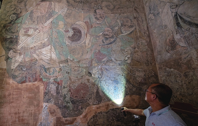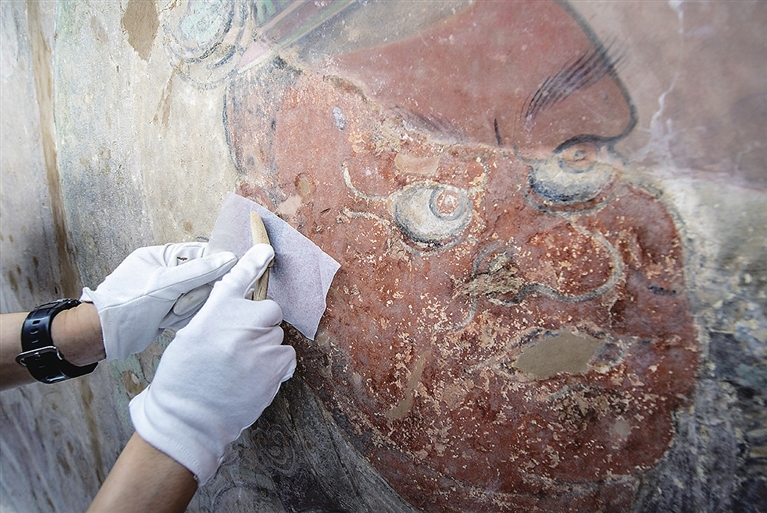 2016年6月,敦煌研究院文物保護技術服務中心對永樂宮壁畫進行詳細勘查,發現永樂宮壁畫存在顏料層起甲、脫落、粉化等病害問題。2019年經國家文物局批準,敦煌研究院文物保護技術服務中心先期開展永樂宮龍虎殿部分壁畫試驗性修復工作。