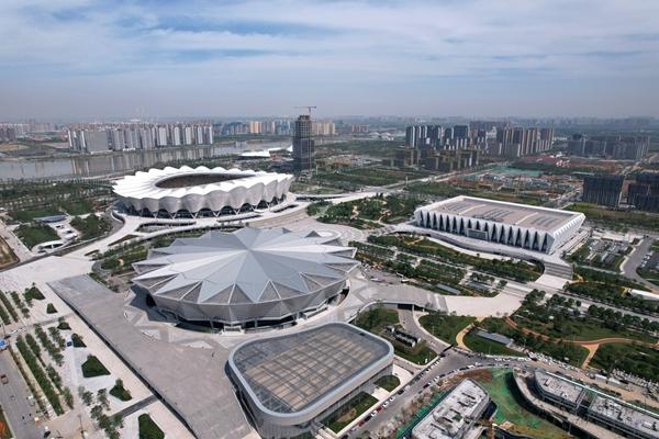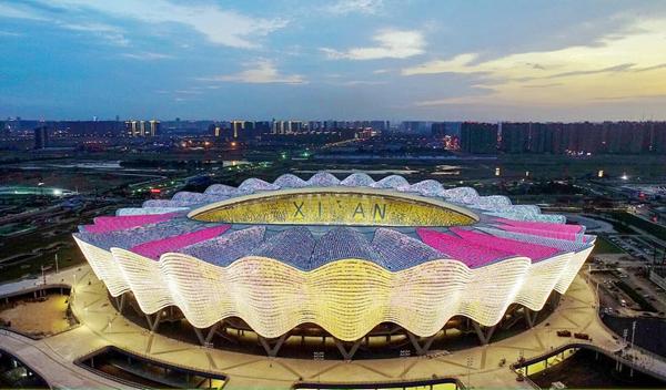 主體育場形態取意西安市花——石榴花,共有14對立面花瓣,通過立面花瓣與絲帶的起伏變化,并采用LED泛光照明,形成傳承歷史、富有現代、動感、韻律的“石榴花”體育場。場館座位數量高達60000座,內有符合國際標準的400m綜合田徑場,其中共設9條環形跑道,西直道10條,跑道采用國際頂級橡膠跑道;跑道內含一塊105m x 68m的國際標準足球場,采用專業級天然草坪,滿足行業最高標準的賽場認證。西安奧體中心主體育場將作為2021年全運會的開幕式及田徑賽事的舉辦場地。