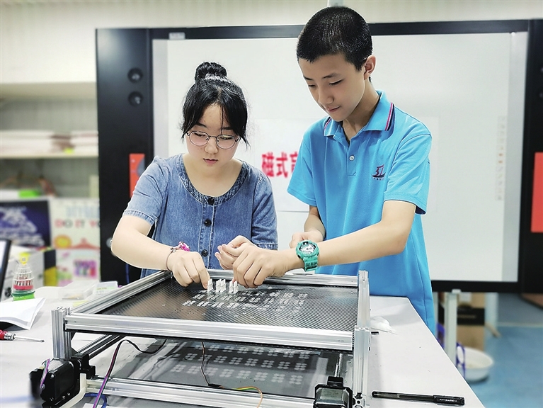 從去年10月起,他們不斷鉆研,請教輔導老師、讓盲童學生嘗試……作品兩次迭代,終于面世。將近一年時間里,兩人抓緊周五的社團活動日,以及大部分的課余時間,改進作品。初二年級學業緊張,但他們沒有因為在研發上投入很多精力而落下功課,相反,各科成績均有明顯提升,在班里名列前茅。