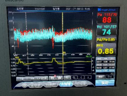 馬登峰對王大爺狹窄的血管進行FFR檢測,將一根壓力微導管送入狹窄血管的遠端,通過連接的儀器進行測試,右冠近端與前降支近端測試FFR值分別為0.91和0.85,均提示不需要植入支架治療,只需要在右冠中段狹窄99%處植入一枚支架。