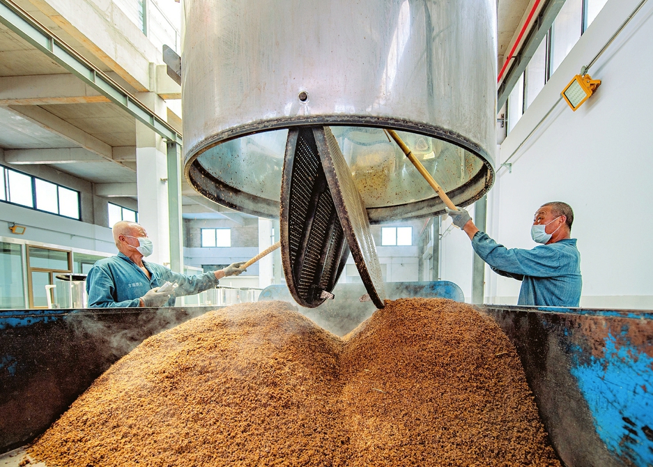 7月14日,山西方源果酒有限公司員工在車間清運酒糟。該公司位于萬榮縣農副產品加工園區,以柿子、蘋果、葡萄等水果為原料,采用低溫發酵方法和生物技術,釀制高端果酒、果醋,年產各類果酒300多噸,年產值可達億元,上繳稅金1000萬余元,提供就業崗位200余個,不僅提高了果品附加值,同時也填補了山西果酒生產的空白。