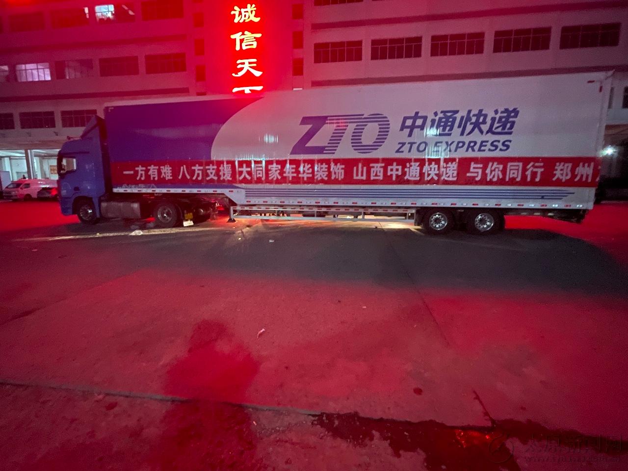 7月23日20時,一輛滿載食品、消毒用品的大型掛車從山西連夜駛往河南,車上裝載的是愛心企業捐贈的援助物資,山西中通免費為其提供了全程運輸服務。與此同時,山西中通管理中心宣布開辟“綠色通道”,為山西寄往河南的快遞提供優先安檢、承運服務。
