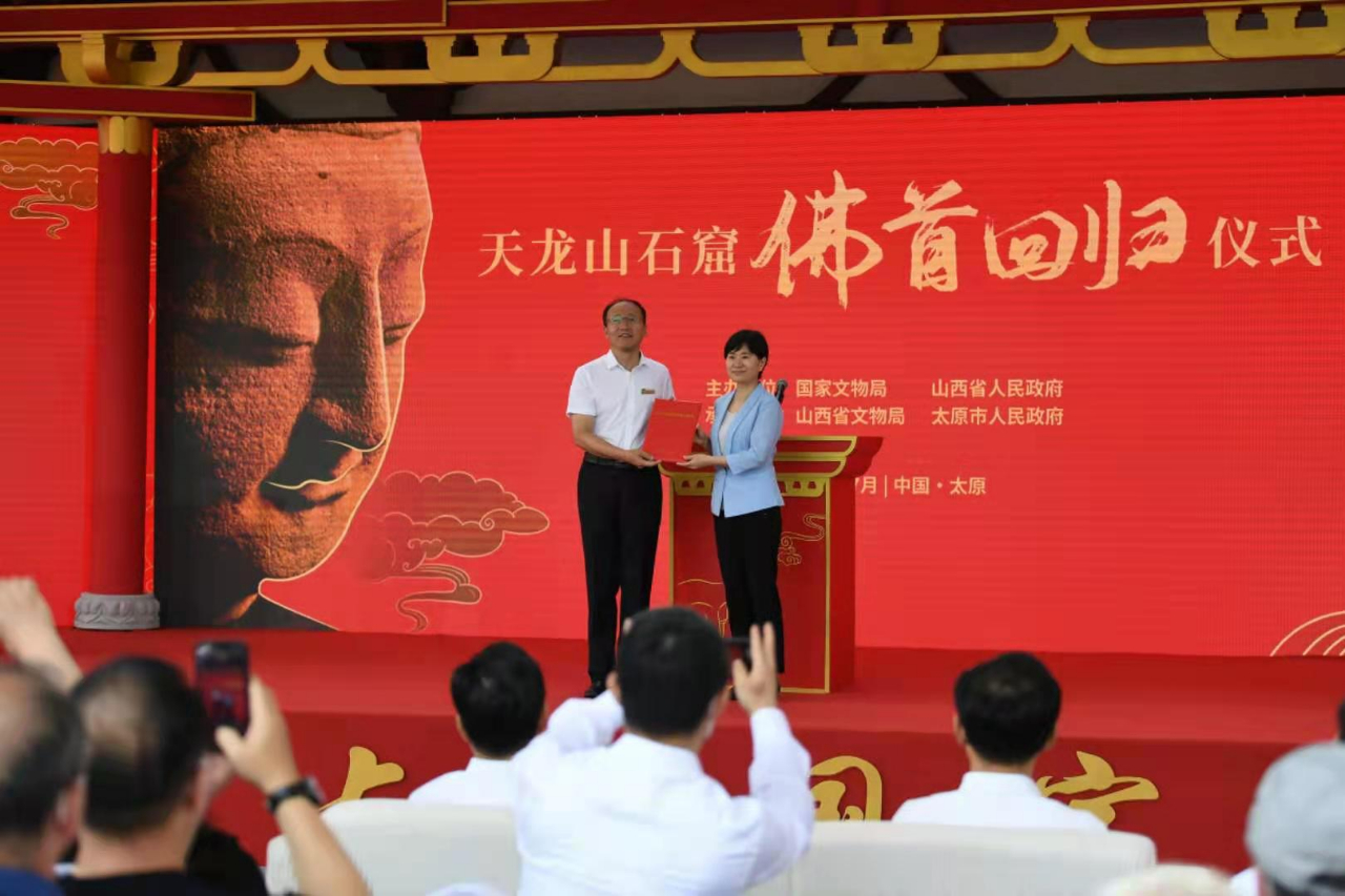 圖為國家文物局政策法規司司長陸瓊向天龍山石窟博物館館長于灝頒發文物入藏清冊。梁琛、米國偉 攝