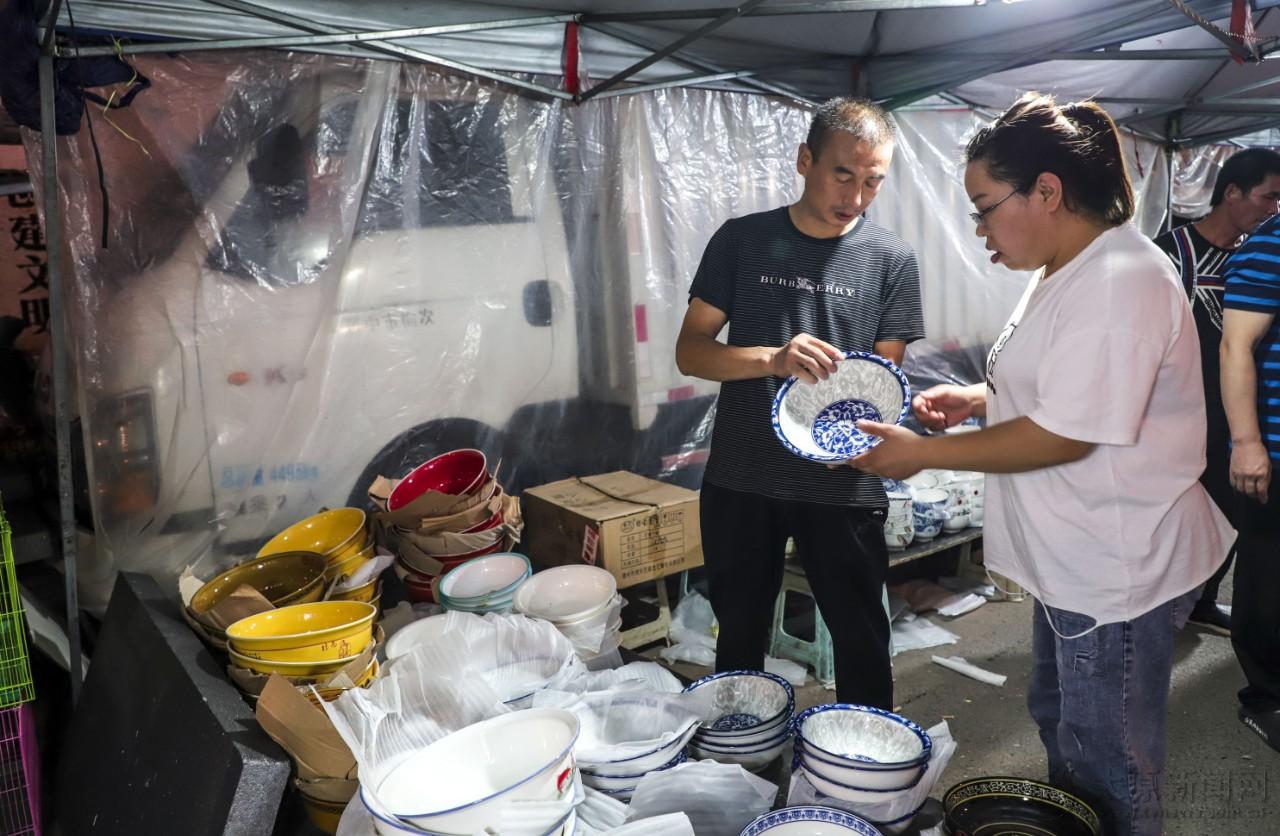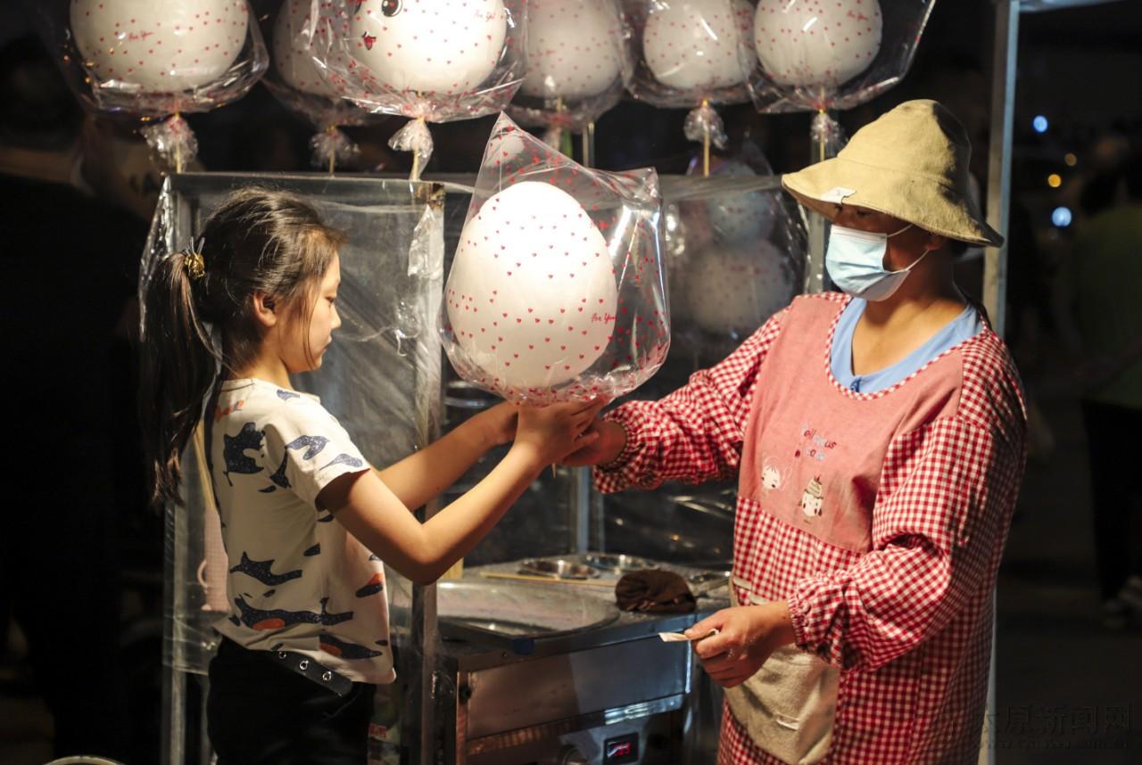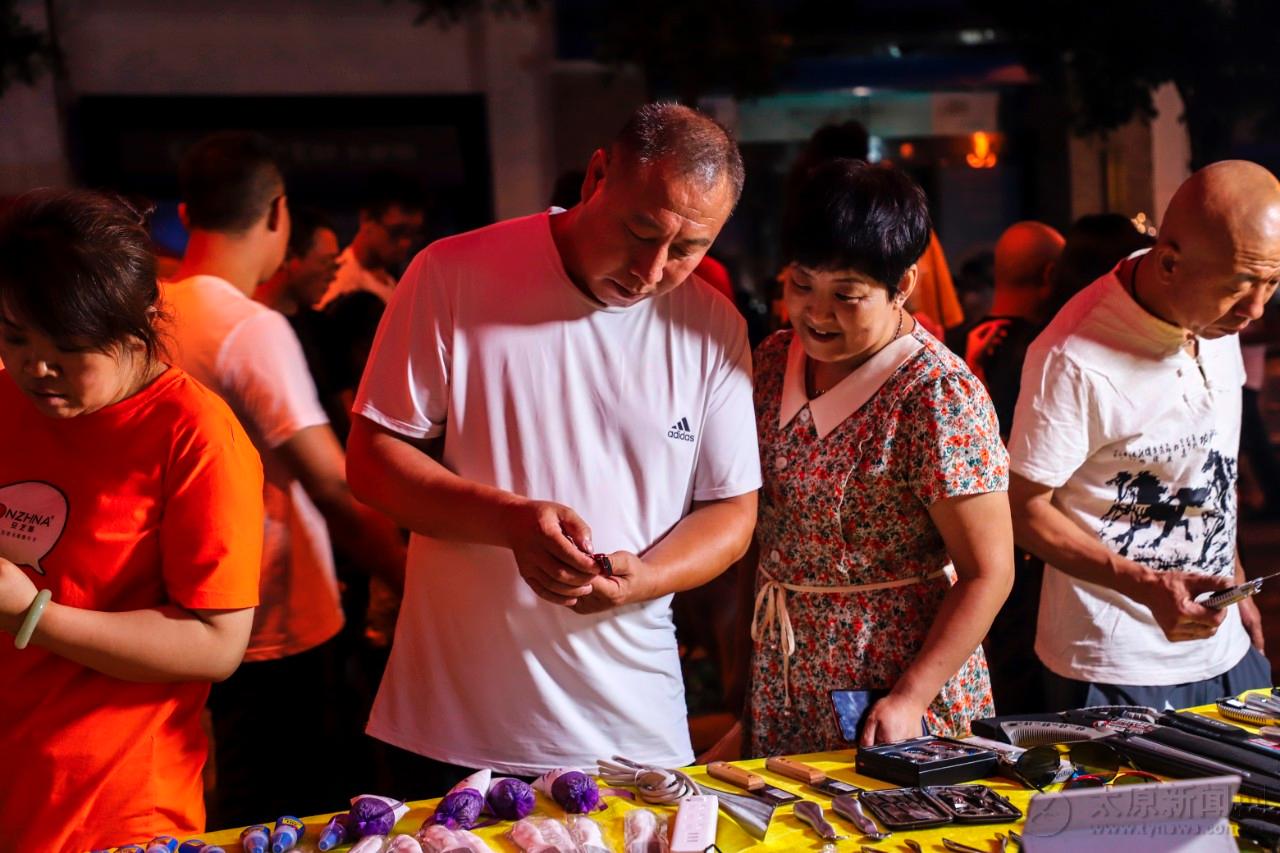 7月29日晚,在第33屆雙塔廟會(huì)上,人們摩肩接踵,一邊前進(jìn),一邊觀看著陳列在攤位上的商品。這次廟會(huì)的商品種類繁多,構(gòu)成了一幅五彩斑斕、充滿民俗與人情的美景。