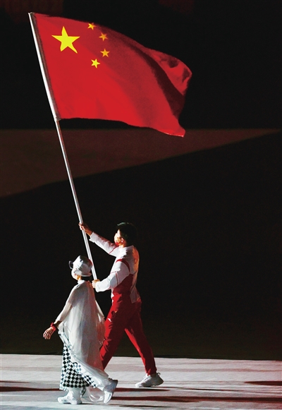由此,奧林匹克再次進入北京時間。從8月8日算起,再過整整180天,明年立春之日,北京冬奧會將拉開帷幕。北京將成為世界首座既舉辦夏奧會,又舉辦冬奧會的“雙奧城”,而跨越13年的奧林匹克,也將再次點燃根植于億萬國人心中的奧運火種。圖為中國代表團旗手蘇炳添進入體育場。