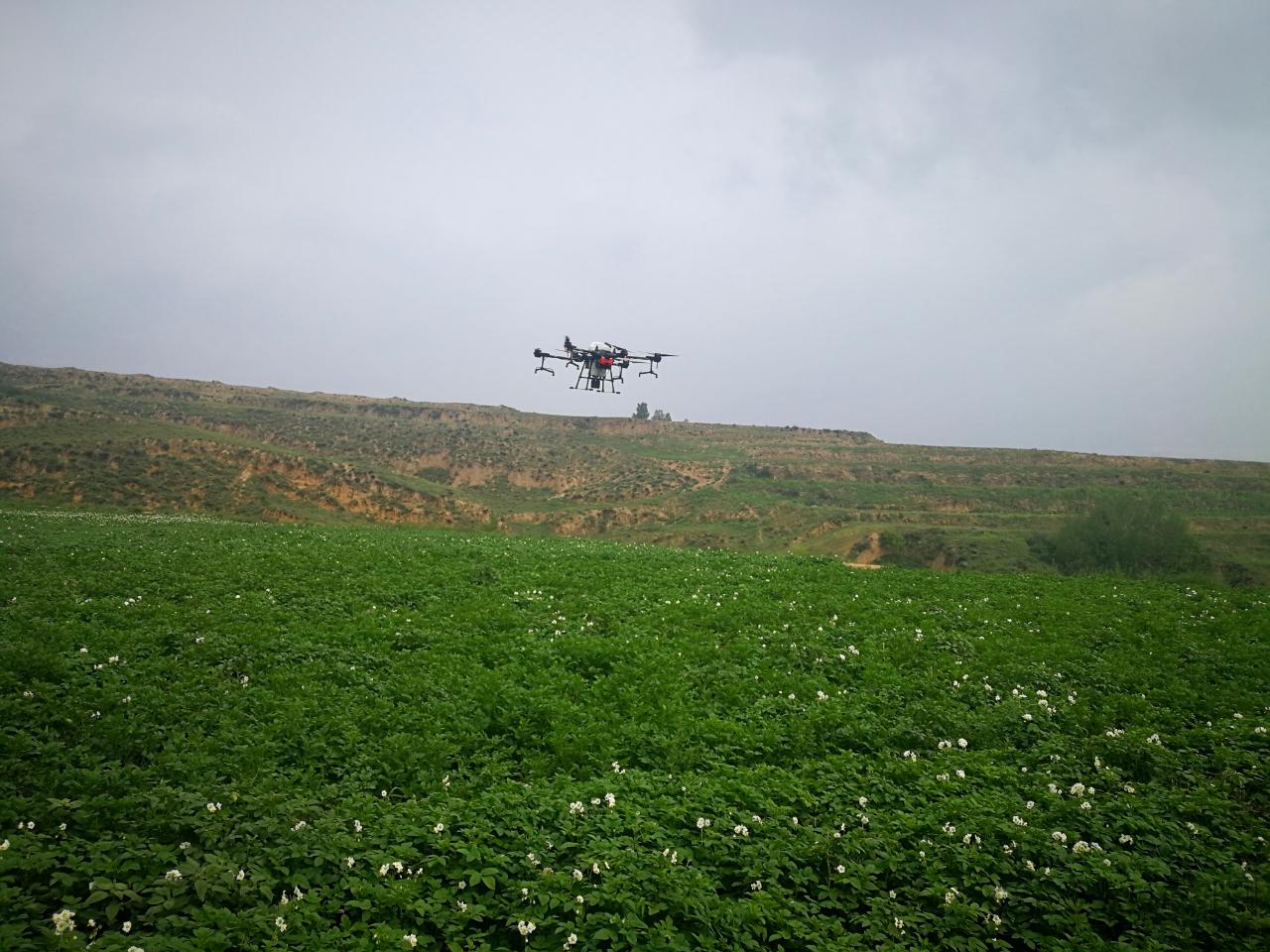 圖為無人機飛防馬鈴薯現(xiàn)場。