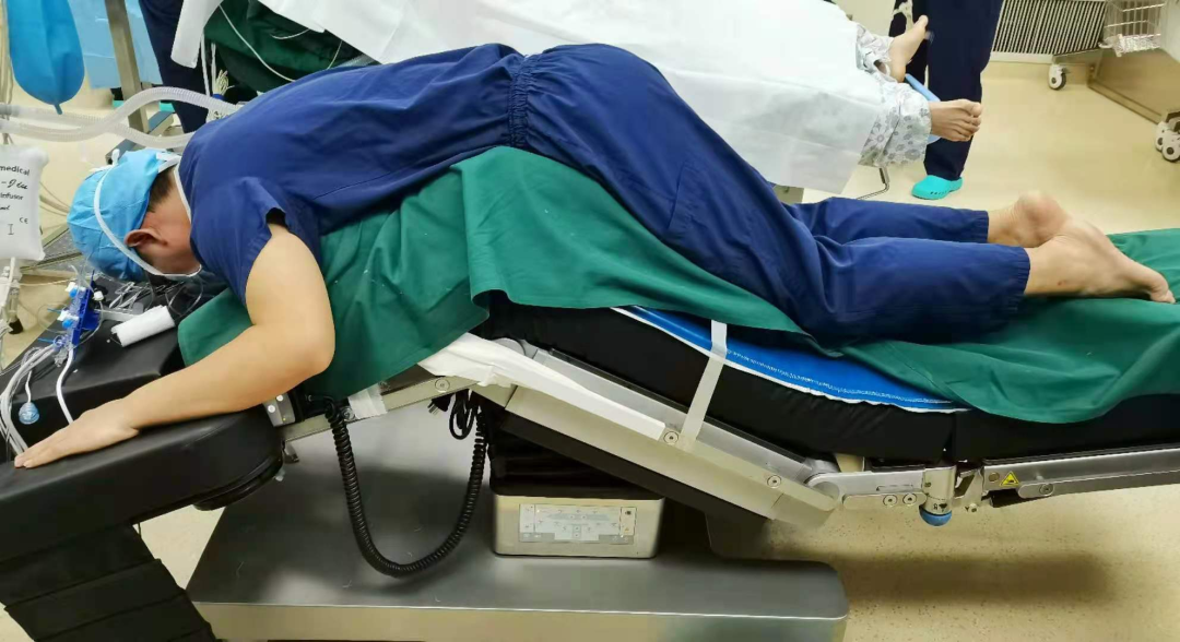 手術的成功關鍵點在于手術體位的擺放,而體位擺放的難點在于如何避免“脆性”脊柱受力和“脆弱”器官壓迫。為了保證術中患者的生理舒適度,在骨科汾東二病區脊柱團隊與外聘專家楊晉才教授、麻醉手術科醫護人員齊心配合下,首先為患者進行了困難氣道插管。