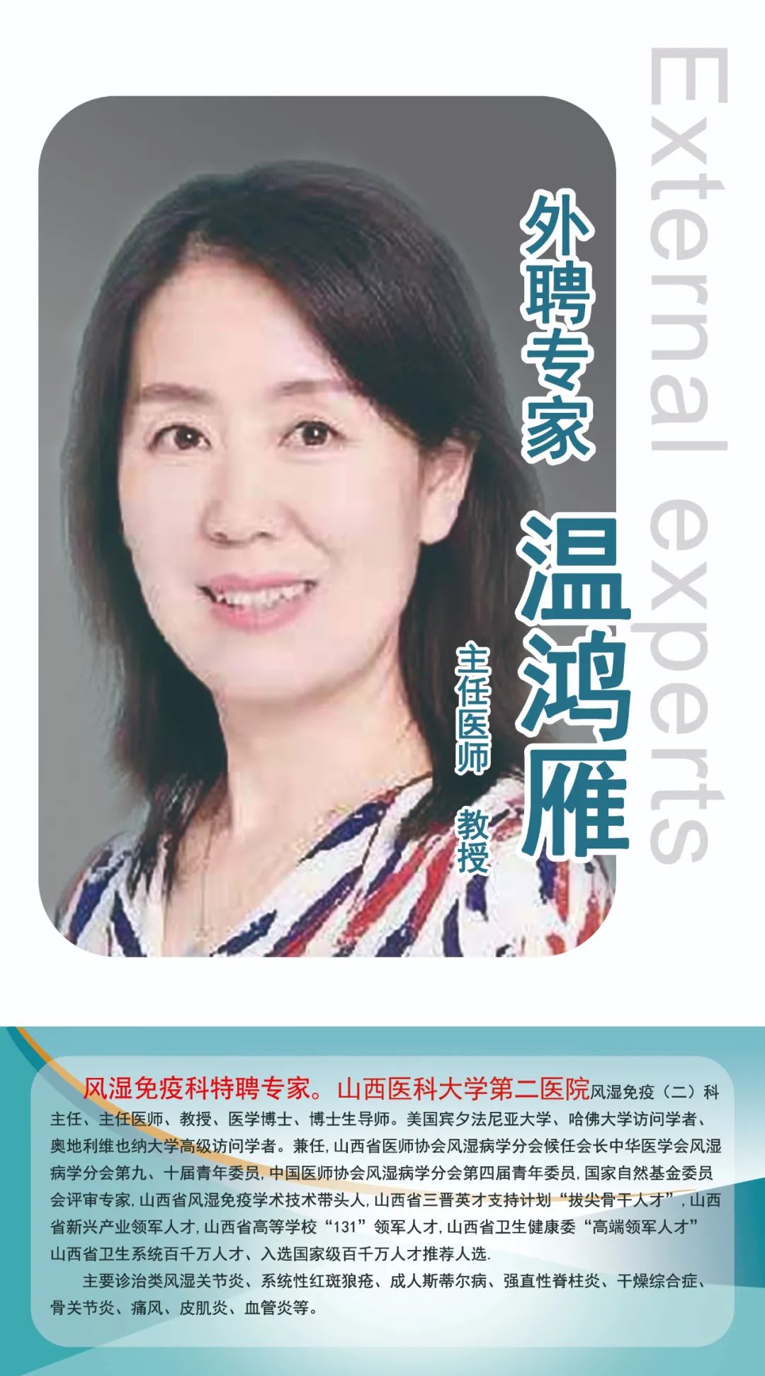 太原市中心醫院風濕免疫科汾東病區于2019年11月創立,集醫療、教學、科研于一體,目前開設床位30張。現有醫護人員19人,外聘教授2名、主任醫師2人、副主任醫師1人、中級職稱4人、博士研究生1人、碩士研究生6人。