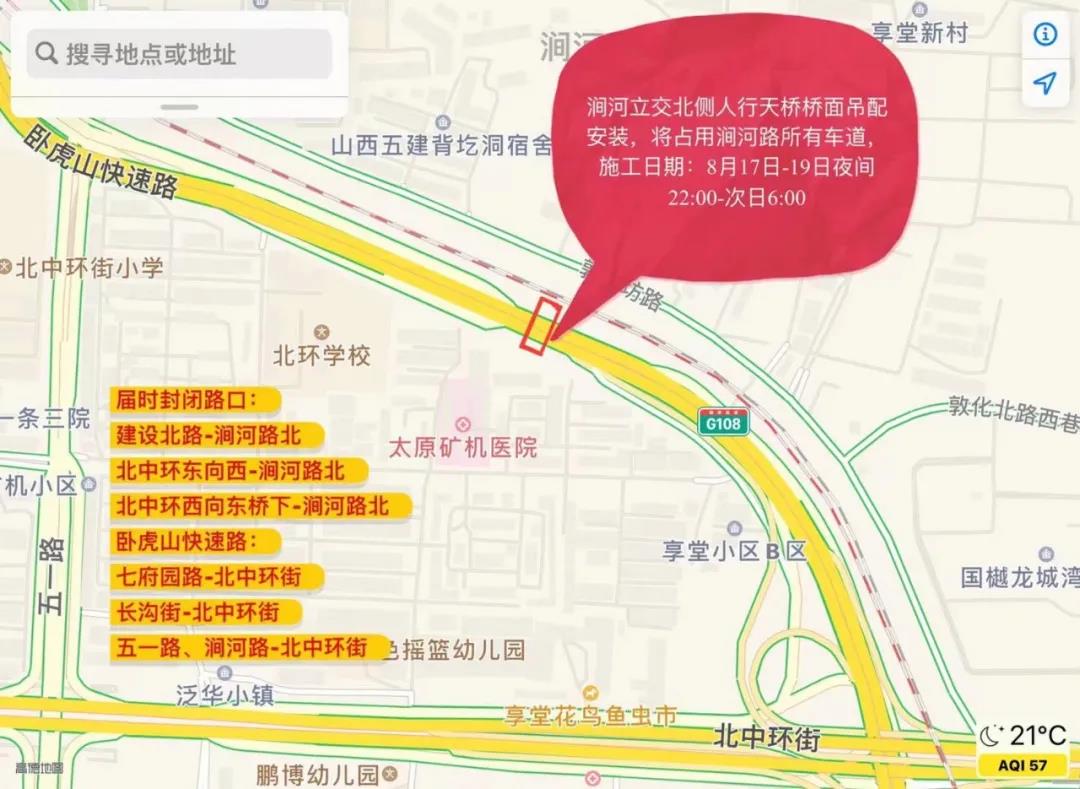 為配合北中環(huán)澗河立交橋北側(cè)人行天橋箱梁吊裝施工,2021年8月17日--8月19日(夜間23:00至次日6:00)將對(duì)澗河路、臥虎山快速路部分路段進(jìn)行臨時(shí)交通管制,禁止一切車輛通行。請(qǐng)途經(jīng)該路段車輛擇道繞行。